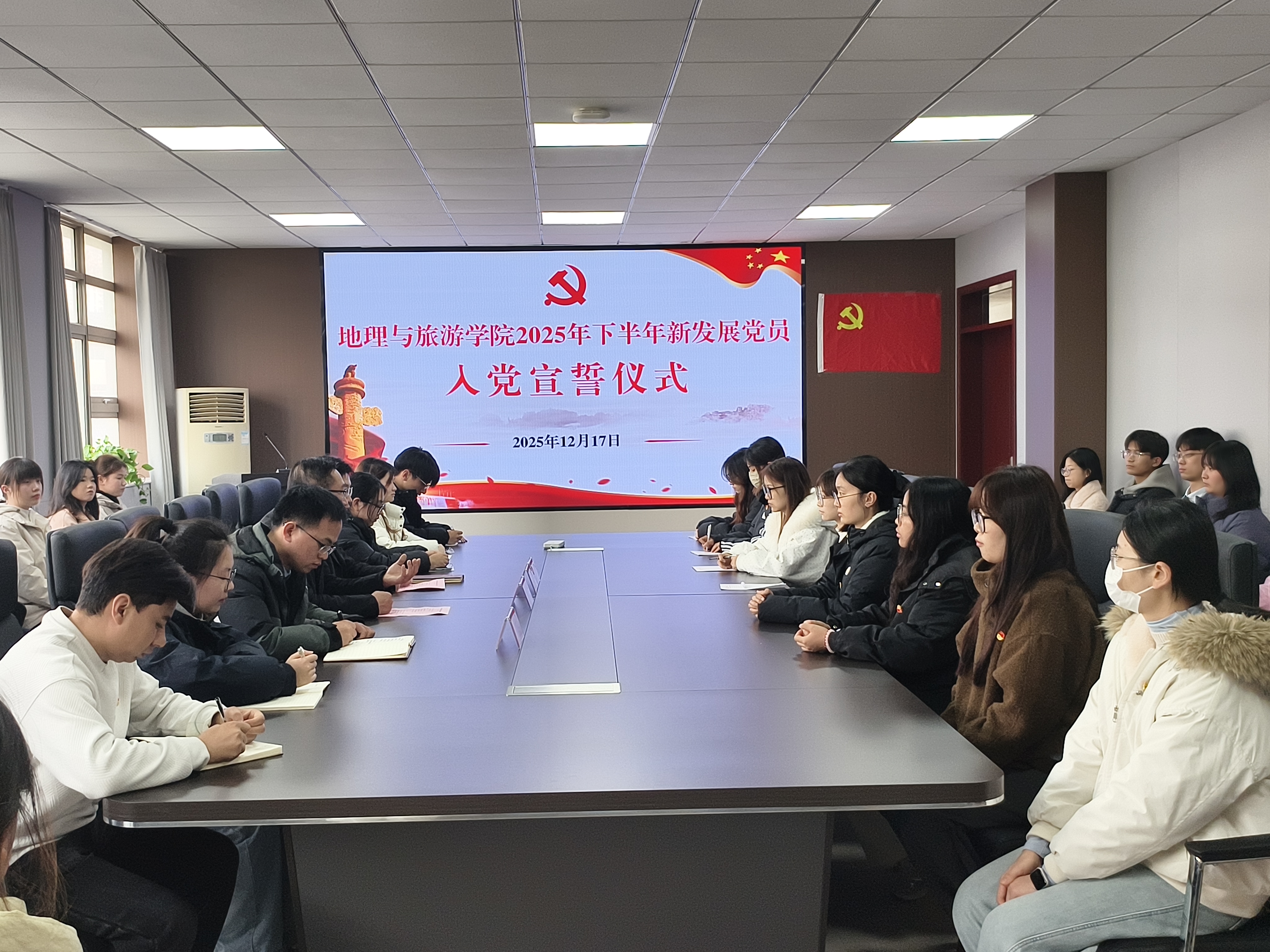 12月17日下午,地理与旅游学院在学院行政楼三楼会议室举行2025年下半年新发展党员入党宣誓仪式,地理与旅游学院党委书记张顺,…
