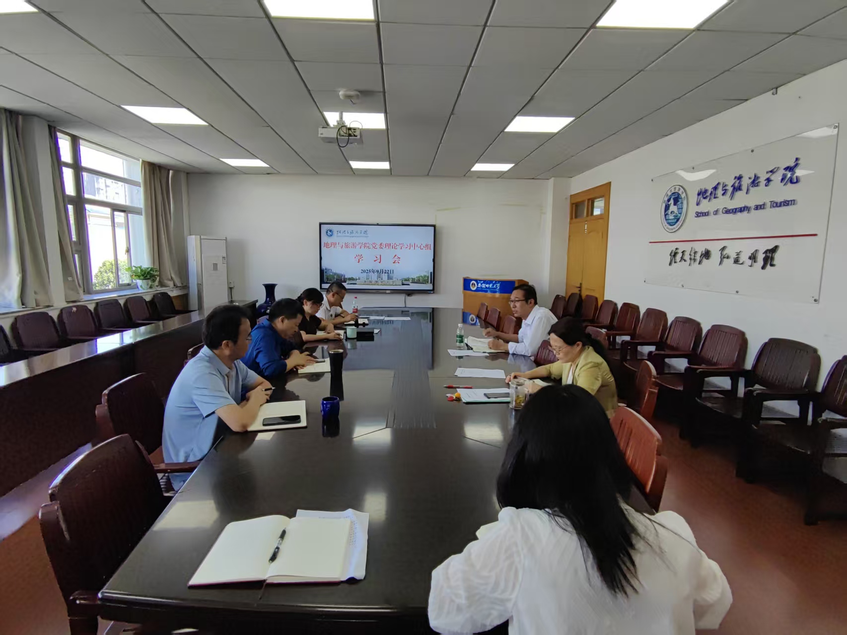 9月22日,地理与旅游学院在学院行政楼四楼会议室召开党委理论学习中心组学习会,专题学习《习近平谈治国理政》第五卷,研究进一步深入学习贯彻的思路和举措。院党委委员参加,院党委书记张顺主持会议。