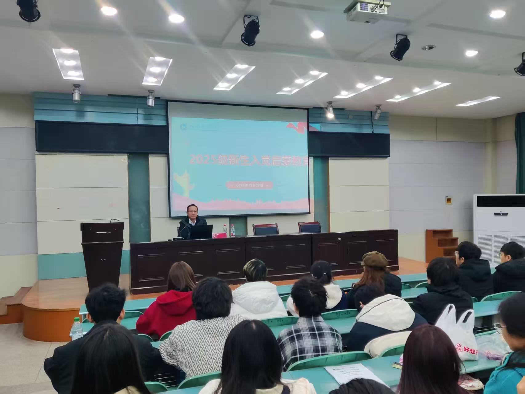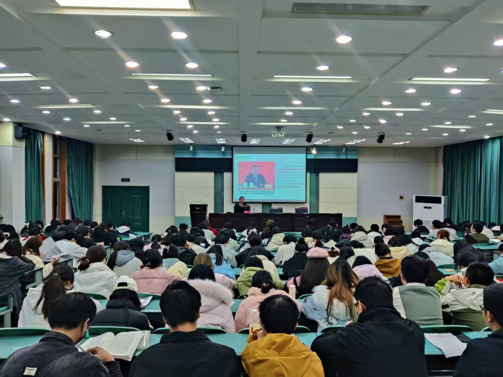 11月28日,地理与旅游学院在实验楼101报告厅举办2025级新生入党启蒙教育专题讲座。本次讲座由学院党委书记张顺主讲,辅导员韩红豆主持,2025级全体本科新生参加。