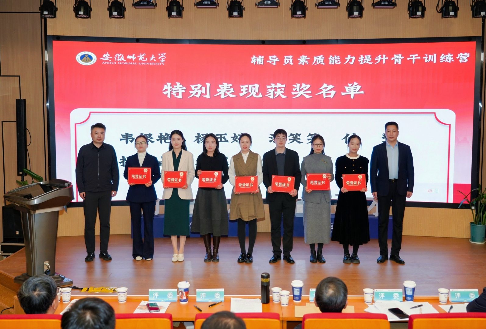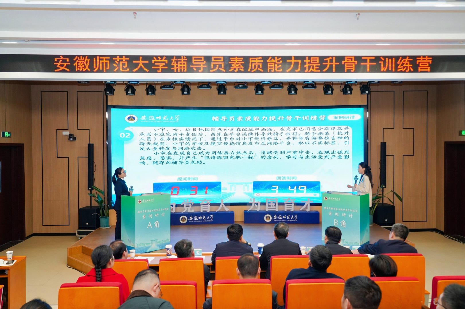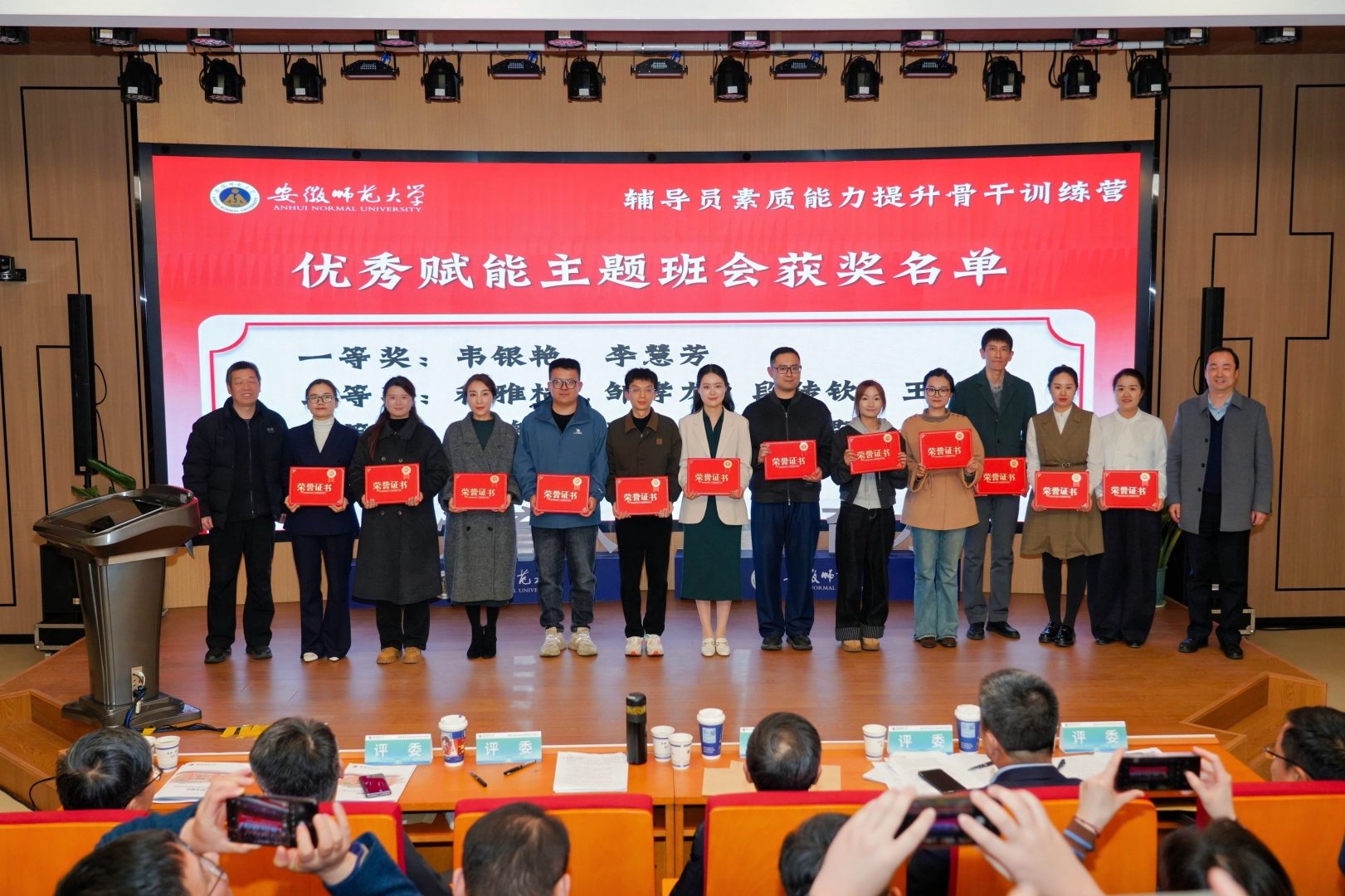 在基础知识、学情分析、案例研讨和谈心谈话环节中,我院韦银艳、操晶晶两位老师凭借在整个赛程中稳定的发挥、专业的分析和出色的应变能力,双双荣获“特别表现奖”,彰显了我院辅导员优秀的个人综合素质。此外,韦银艳凭借其精心设计与扎实实施的育人实践,荣获“优秀赋能主题班会”一等奖第一名,并在训练营的“赋能成长”环节中面向全校辅导员进行了公开展示。凭借在活动组织、人员参与及整体成绩上的优异表现,地理与旅游学院荣获大赛“优秀组织奖”。