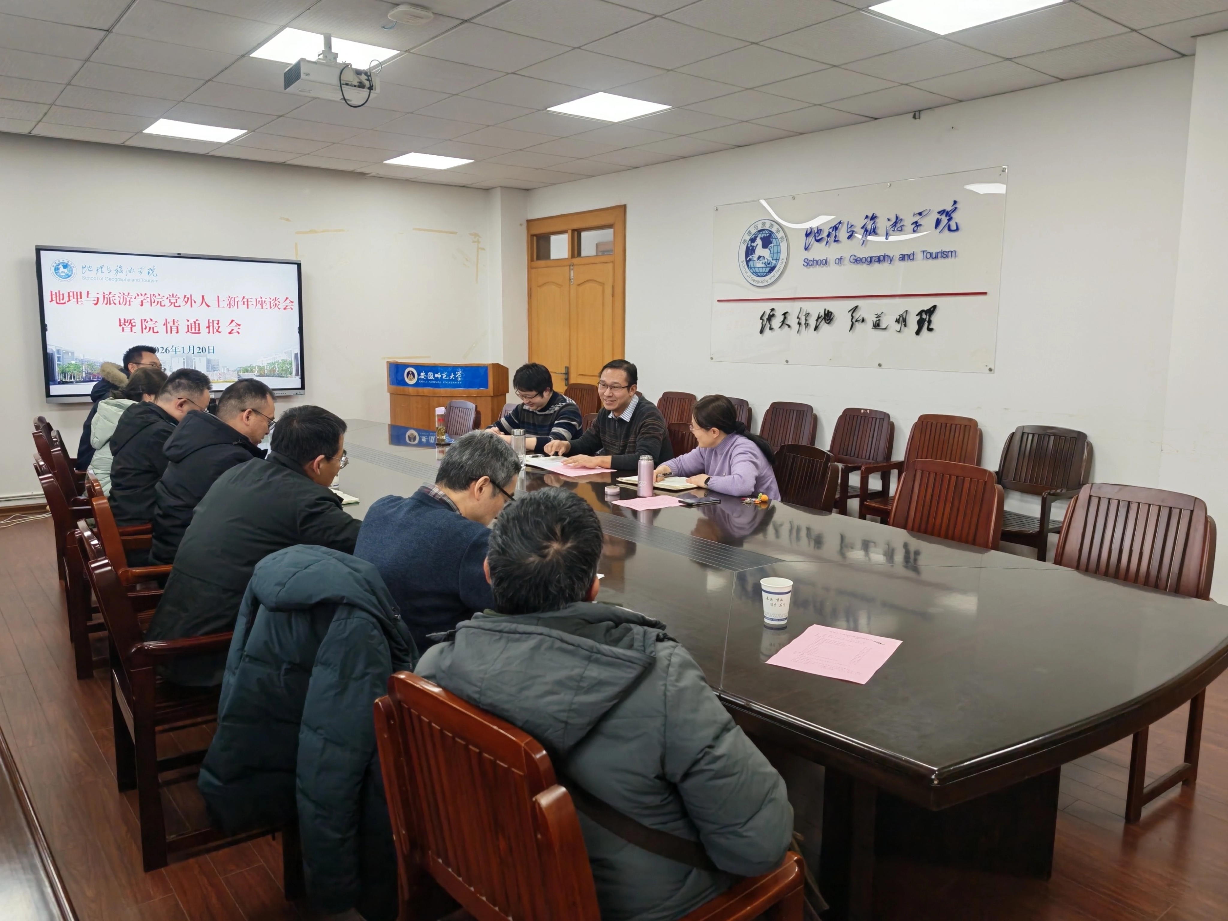 1月20日下午,地理与旅游学院在学院行政楼四楼会议室召开党外人士新年座谈会暨院情通报会,深入学习贯彻党的二十届四中全会和习近平总书记在党外人士座谈会上的重要讲话精神,就科学制定和接续实施“十五五”规划征求意见建议。地理与旅游学院党委书记张顺,党委副书记、院长方凤满,各民主党派成员和无党派人士参加。会议由学院党委副书记钱程主持。