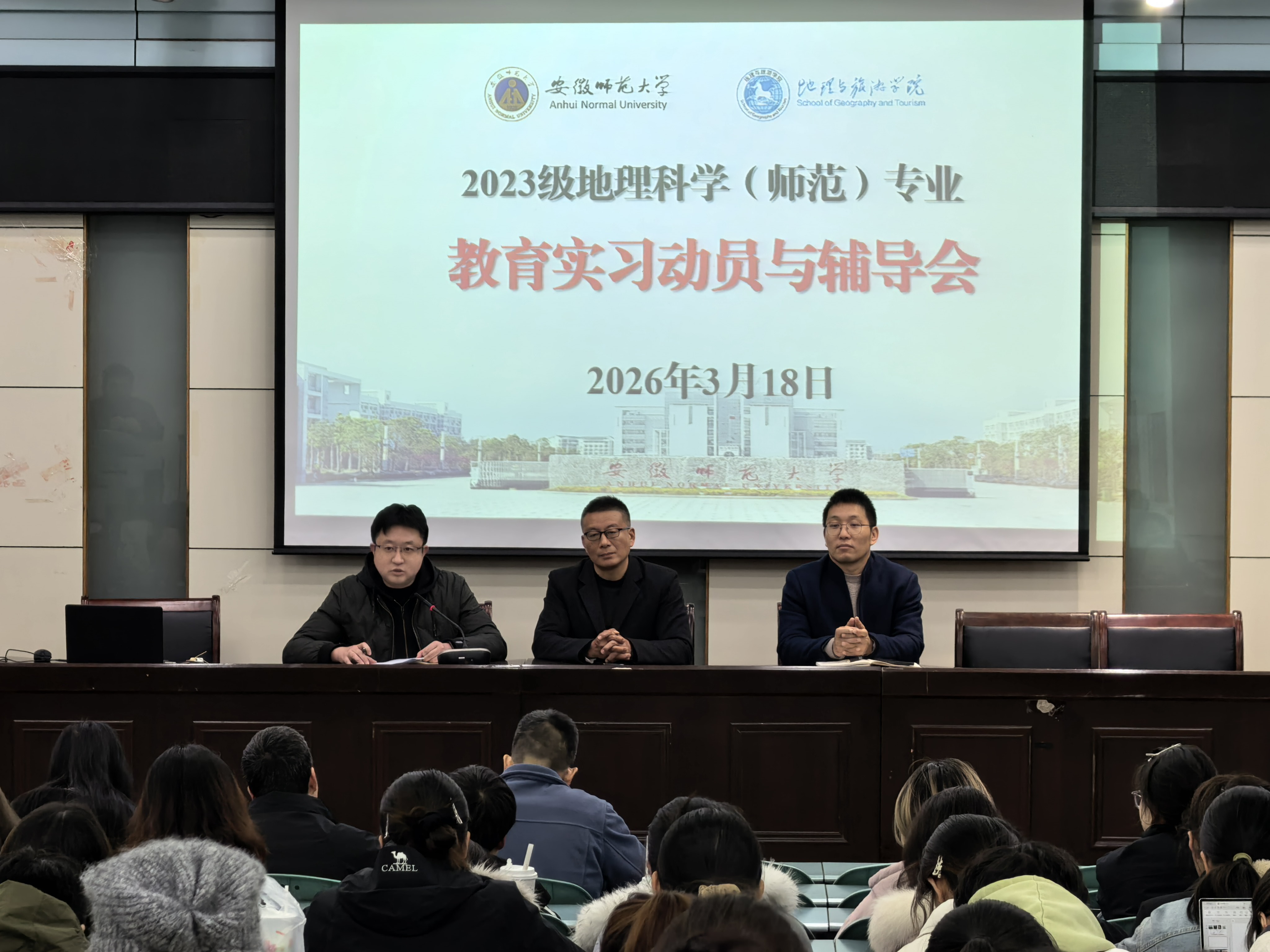 为扎实推进师范生教育实习工作,引导学生明确实习任务、强化纪律意识、提升实践能力,3月18日下午,地理与旅游学院在实验楼101报告厅召开2023级地理科学(师范)专业教育实习动员大会。学院党委副书记钱程、副院长孙鹏,实习指导教师组组长朱永恒,各实习小组指导教师,辅导员及2023级地理科学(师范)专业全体学生参加会议。