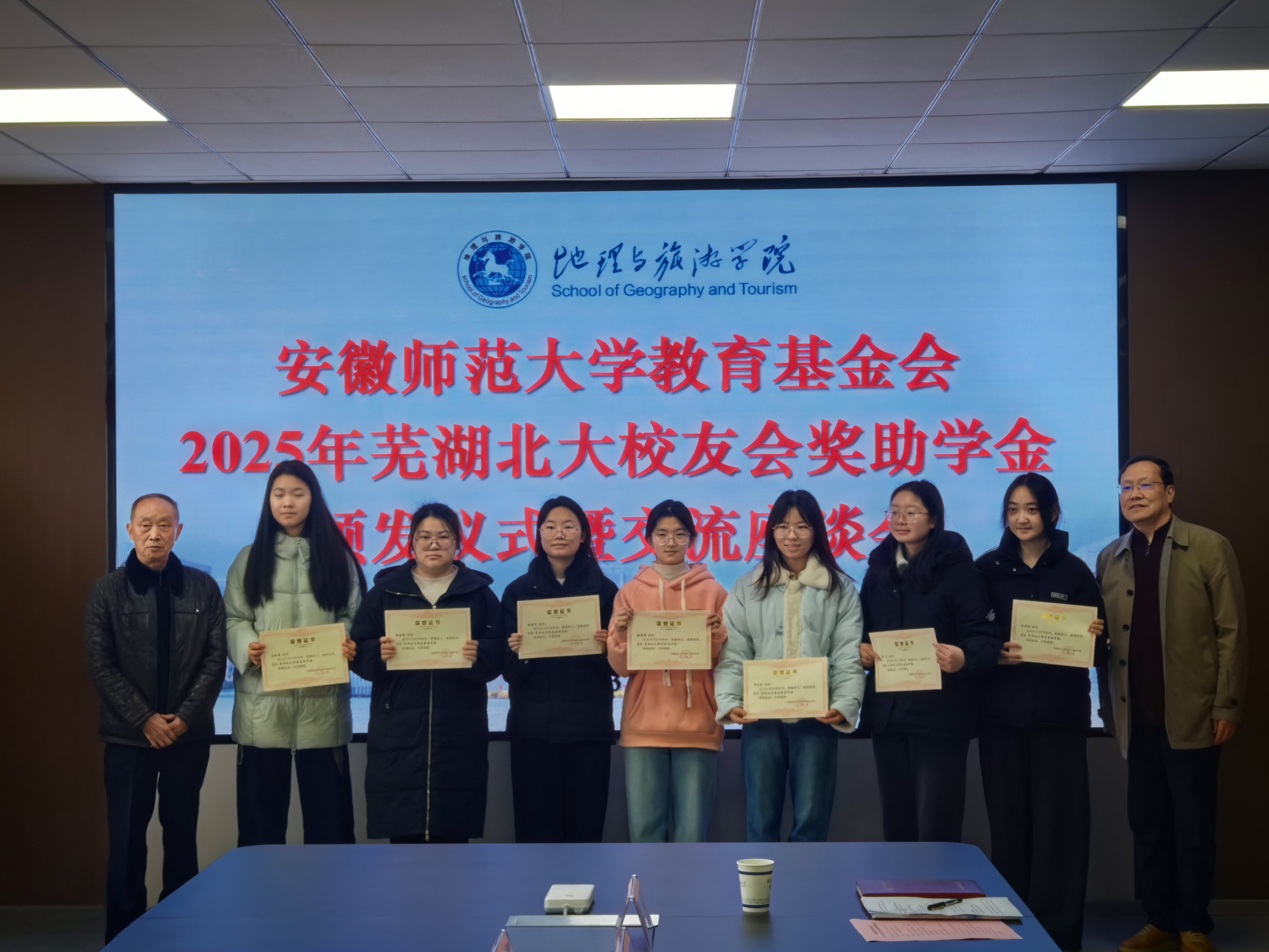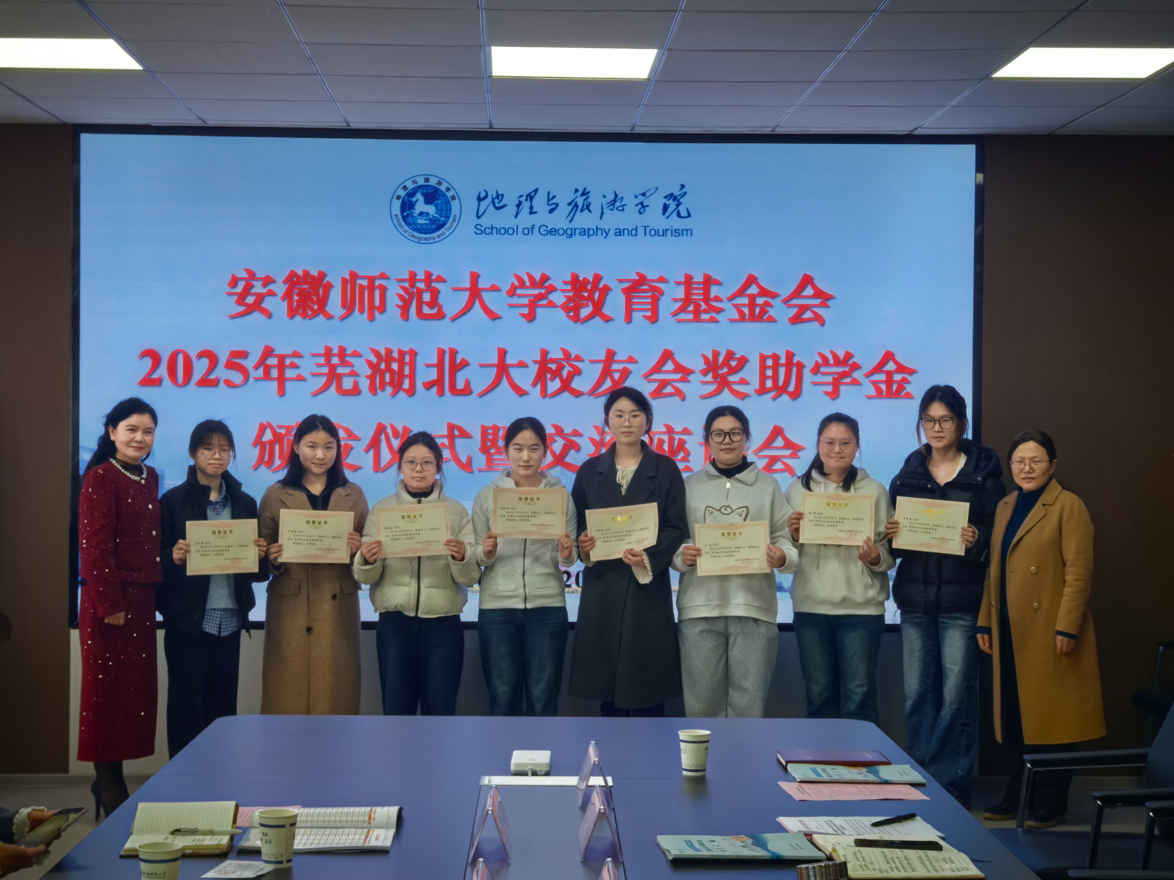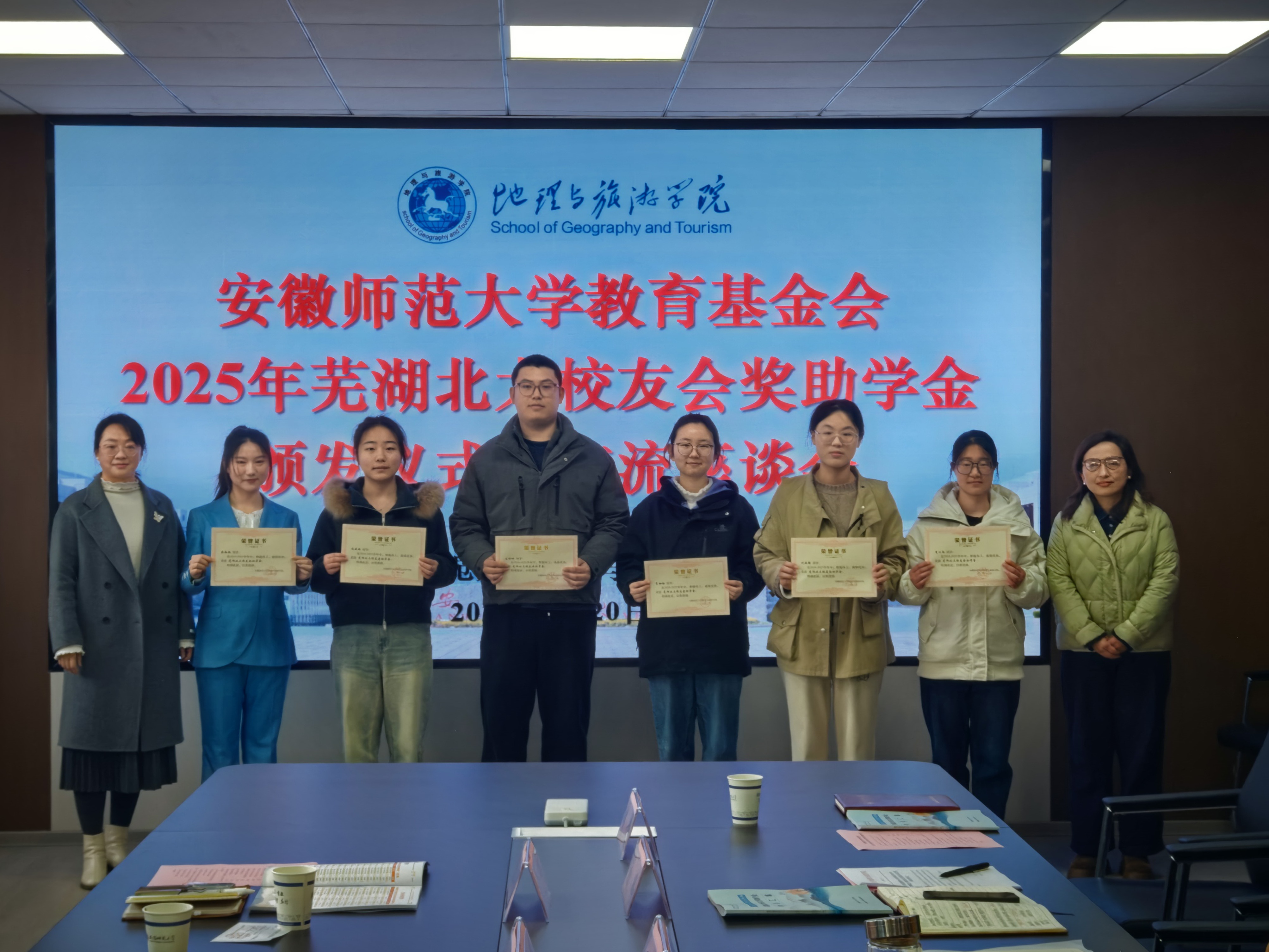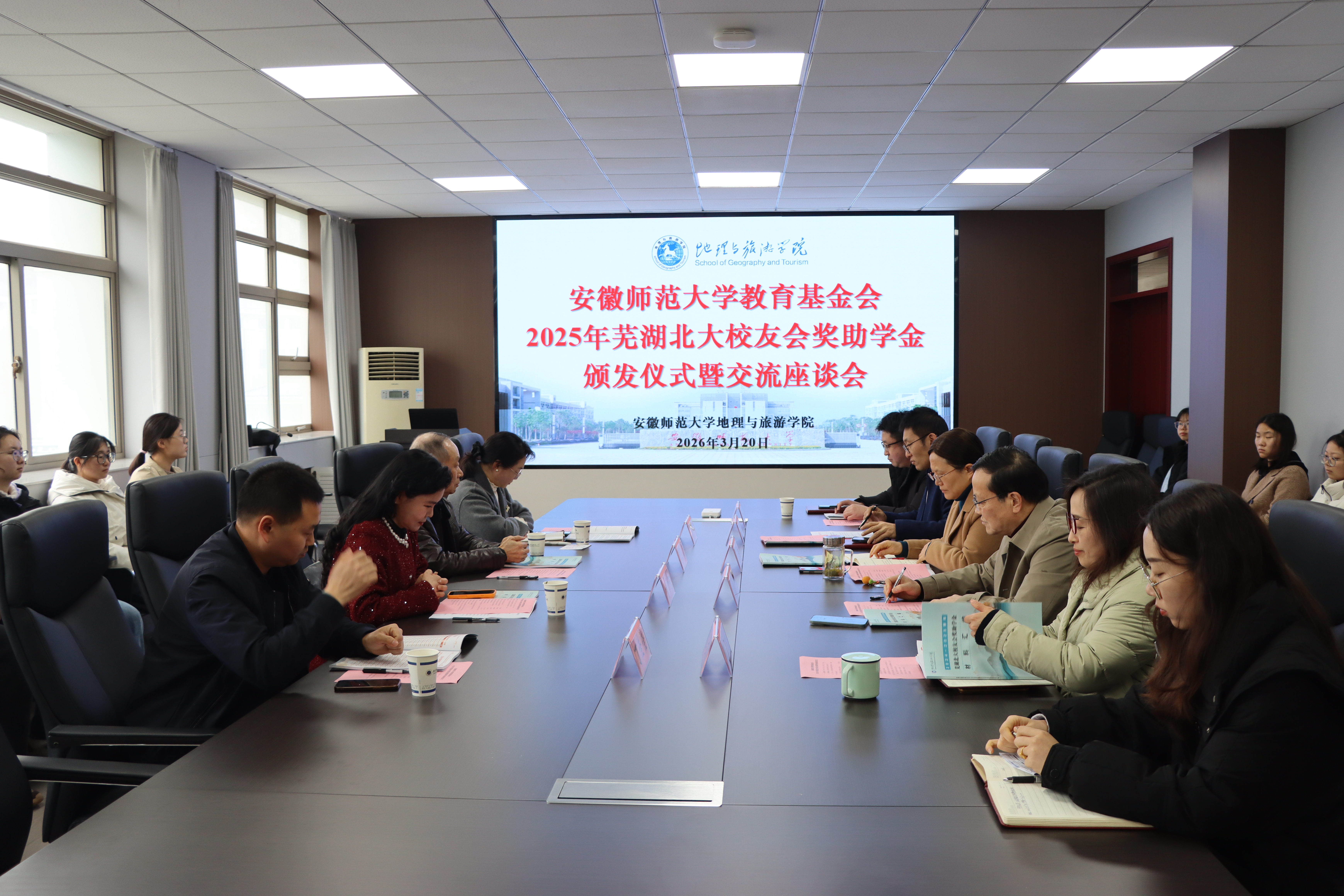 3月20日,地旅学院在学院行政楼三楼会议室举行2025年“芜湖北大校友会”奖助学金颁发仪式暨交流座谈会,北京大学芜湖校友会副会长周玉森,常务副会长童劭琼,副秘书长陶晓燕,芜湖传媒集团新视界媒体中心首席记者丁佳佳,校教育基金会副理事长余国升,学院院长方凤满,副院长孙鹏、汪文文以及地理与旅游学院专兼职辅导员、获奖受助学生代表参加颁发仪式,仪式由学院党委副书记钱程主持。