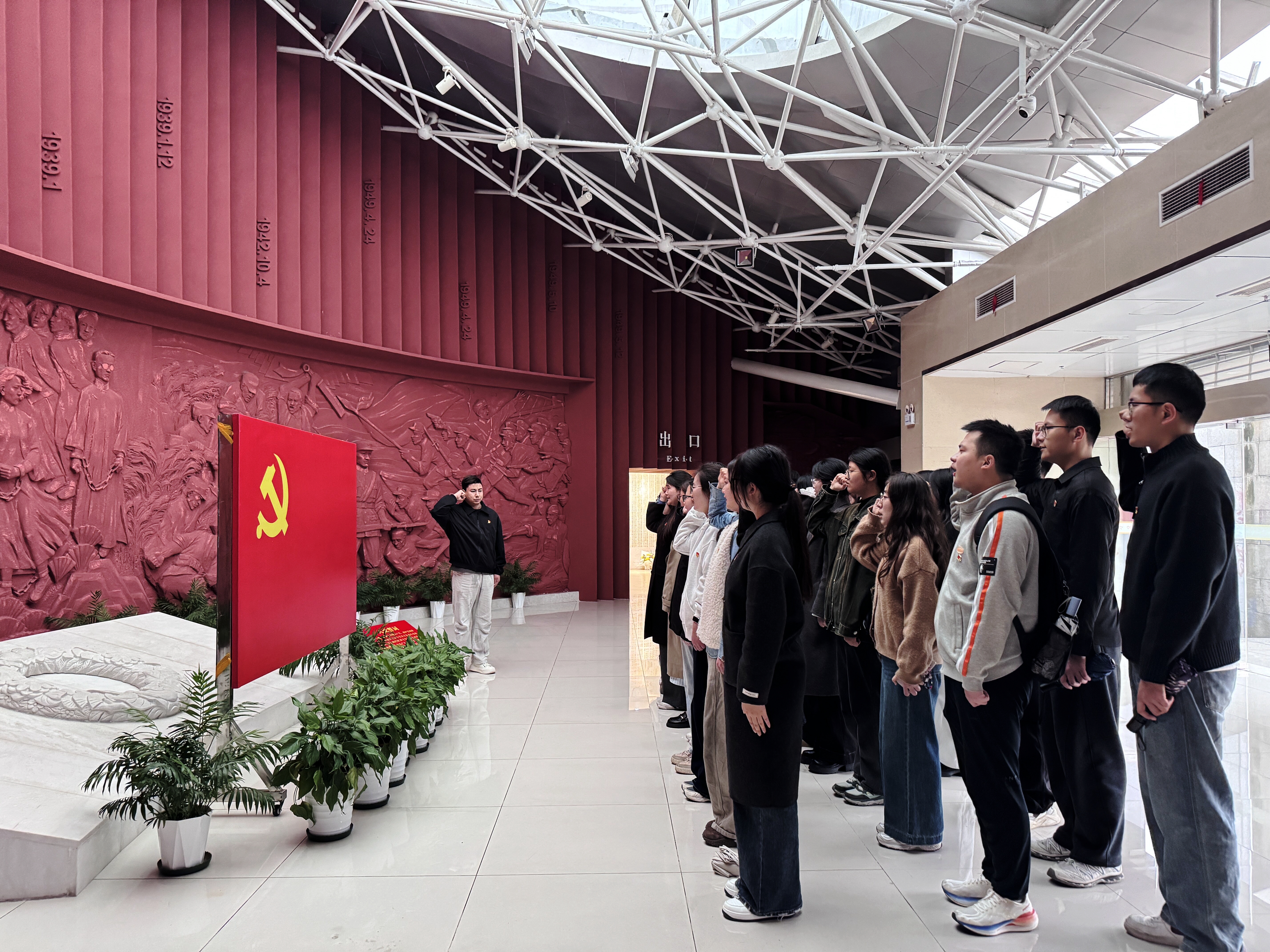 参观结束后,全体师生肃立于纪念馆大厅,在烈士群雕的无声注视下,面向鲜红党旗庄严宣誓;在“中国大学生自强之星标兵”、2024级学科教学(地理)专业研究生阿卜来提·阿卜力克木的领誓下,全体学生党员高举右拳,目光坚定,“我志愿加入中国共产党……”的铿锵誓言在馆内久久回荡,与窗外的淅沥雨声交织共鸣,仿佛是对英烈忠魂的深情告慰。这一刻,历史与现实交汇,青春与信仰同频,全体师生在铮铮誓言中重温入党初心,在肃穆缅怀中汲取奋进力量。