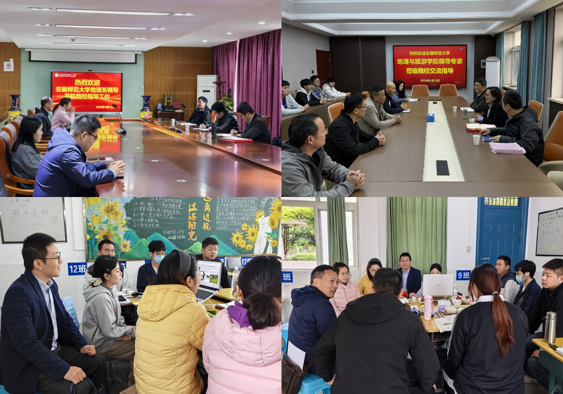 走访期间,学院领导老师深入实习生办公室、宿舍和教学场所,与同学们亲切交谈,仔细查看听课记录本、教案编写本及教学反思日志,实地了解实习生的工作、学习和生活状况。在宣城二中、无为一中、铜陵一中等实习点,学院领导老师现场观摩了实习生代表讲授的《农业区位因素》《工业区位因素及其变化》《人类面临的主要环境问题》等公开课,课后与实习学校教研组老师一同开展评课研讨,从教学设计、课堂组织、师生互动、课程思政、地理核心素养落实等方面进行细致点评和专业指导,勉励同学们珍惜宝贵的实习机会,虚心向一线教师请教,在实践中检验所学、发现不足、积累经验,努力提升课堂教学能力和班级管理素养,同时要时刻绷紧安全弦,严格遵守实习纪律和学校规章制度,展现地旅学子良好风貌。