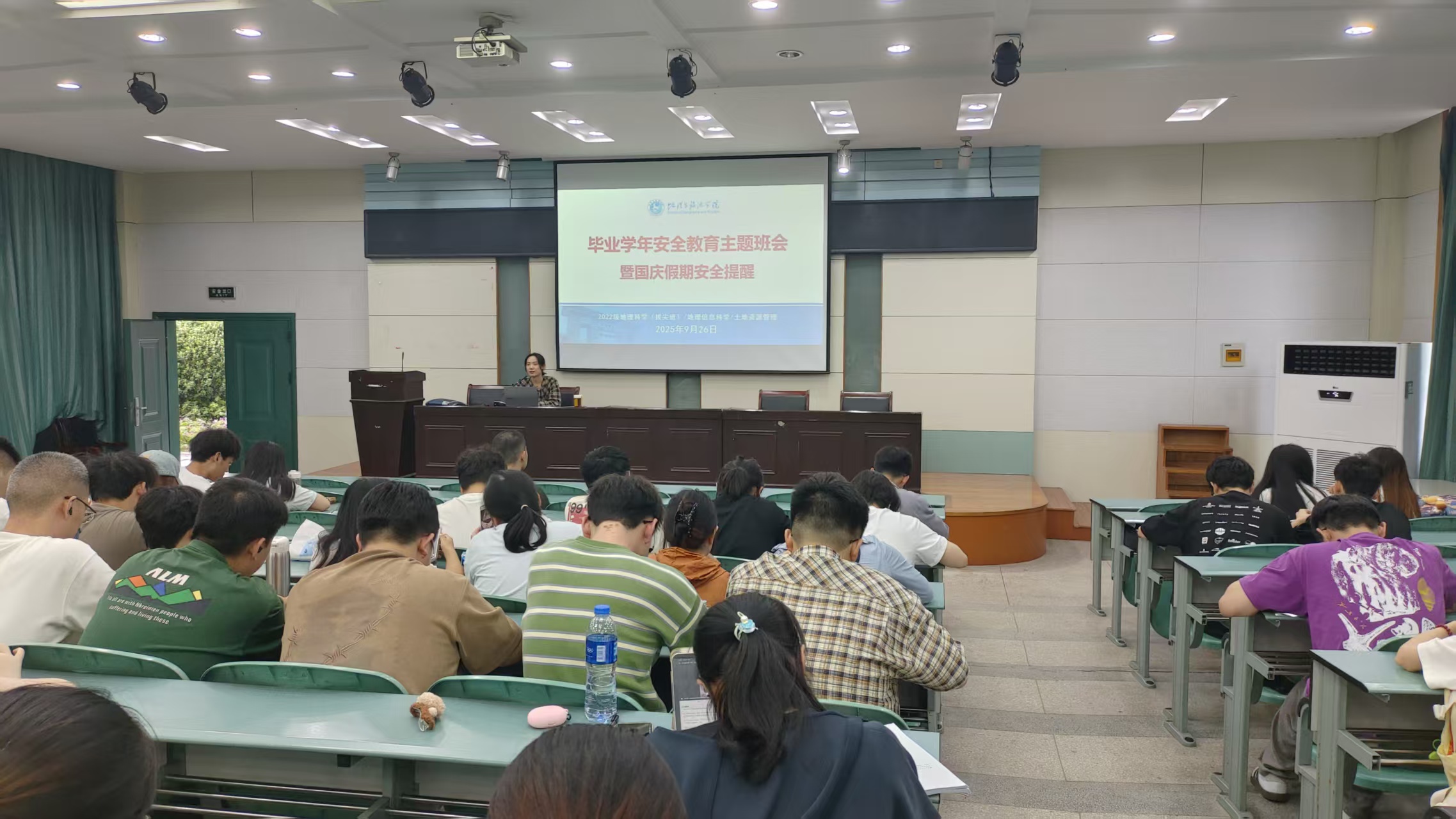 2025年9月26日,地理与旅游学院2022级地理科学(拔尖班)、地理信息科学、土地资源管理专业全体同学齐聚实验楼101报告厅,召开毕业学年安全教育主题班会暨国庆假期安全提醒专题会议。班会由陈祥云主持。