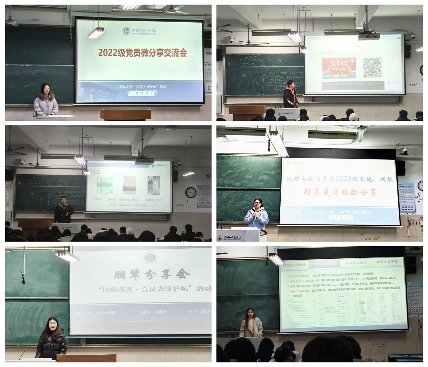 经验传承促成长,朋辈引领启新程,为充分发挥优秀学子的示范引领作用,助力新生顺利适应大学学习节奏、科学备战期末考试,2025年12月,地理与旅游学院团委学生会精心组织开展了“团结花开”党员先锋护航暨期末备考经验交流分享活动。学院2022级各专业优秀学生代表应邀进行分享,活动在教学楼多个教室同步进行,2025级全体新生积极参与。