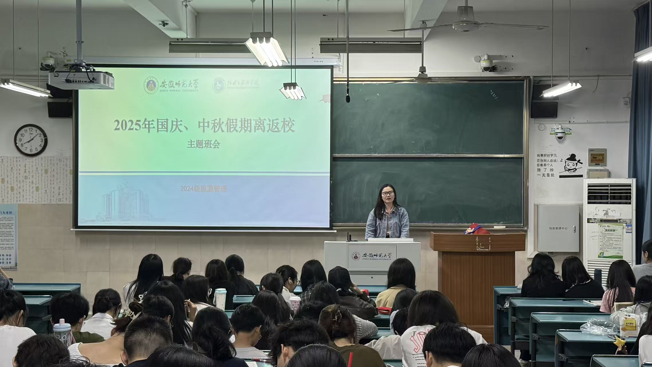 9月24日,地旅学院2024级旅游管理专业于行知楼2040101教室召开2025年国庆、中秋假期离返校主题班会。本次班会由辅导员韦银艳老师主持,2024级旅游管理专业全体同学参会。