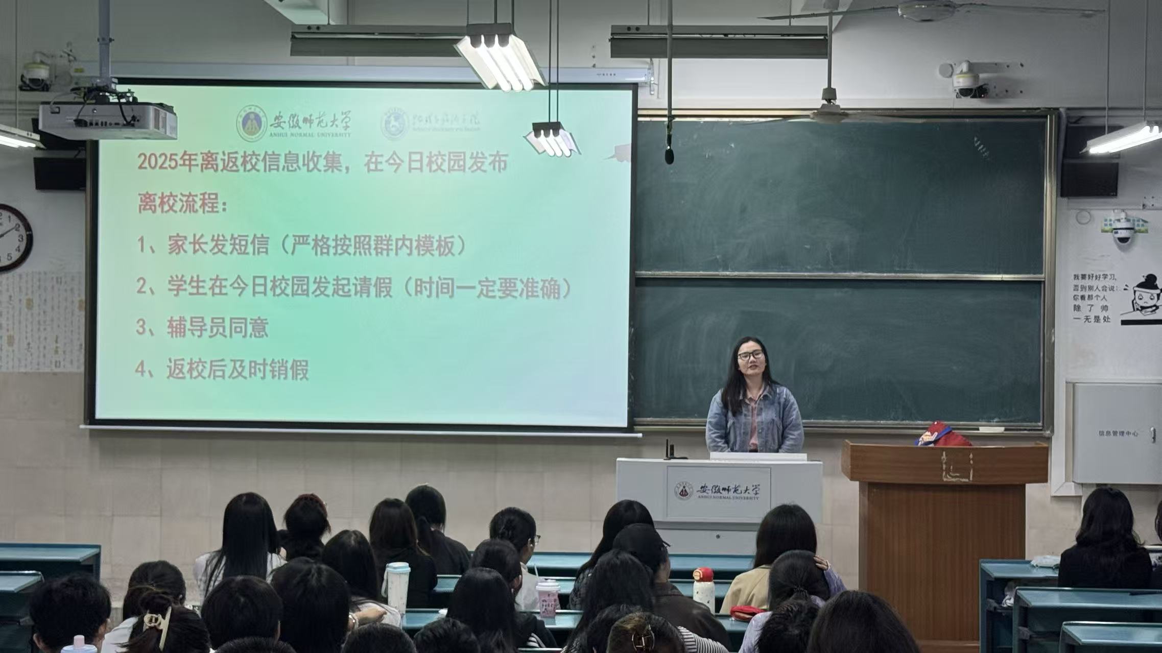 班会伊始,韦银艳老师首先围绕《关于2025年国庆节、中秋节教学安排的通知》,详细讲解了假期时间安排,提醒同学们提前规划好学习与假期生活。针对离返校流程,韦银艳老师重点强调请销假流程,要求同学们提前做好规划,确保离返校管理规范有序。最后,韦银艳老师结合班级群内发布的身边诈骗案例,开展防电信诈骗宣传,提醒同学们要提高警惕,增强安全防范意识,避免财产损失。