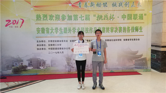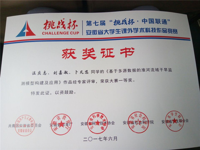 本网讯(国旅学院 赵 将 孙 鹏)青春新动能,挑战新未来。6月5日上午,由共青团省委、省教育厅、省科协、省学联联合主办,安徽理工大学承办,中国联通安徽省分公司协办的第七届“挑战杯·中国联通”安徽省大学生课外学术科技作品竞赛终审决赛在安徽理工大学落下帷幕。淮南市市委副书记王崧,团省委副书记李国阳,省科协副主席蔡士祥及安徽理工大学领导等出席闭幕式并为获奖选手和单位代表颁奖。由国旅学院孙鹏副教授、方凤满教授指导的温庆志、刘嘉敏等同学的作品《基于多源数据的淮河流域干旱监测模型构建及应用》荣获大赛自然科学类数理专项一等奖的好成绩。